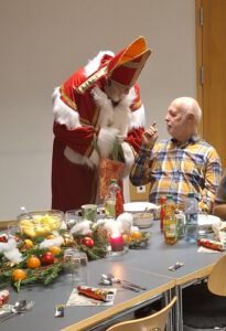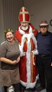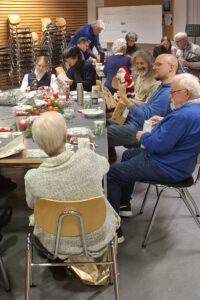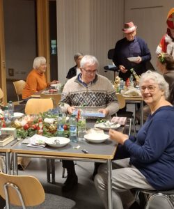 Nach der Probe haben wir Tische zusammen gestellt, dekoriert, leckere Maultaschen und Kartoffelsalat von der Mittleren Mühle Holzgerlingen besorgt, Glühwein heiß gemacht, Nachtisch kalt gestellt und dann gefeiert. Sogar der Nikolaus hat einen kurzen Stopp bei uns gemacht und die Schrottwichtel Geschenke verteilt. Es ist schon erstaunlich, was die Keller so alles hergeben.